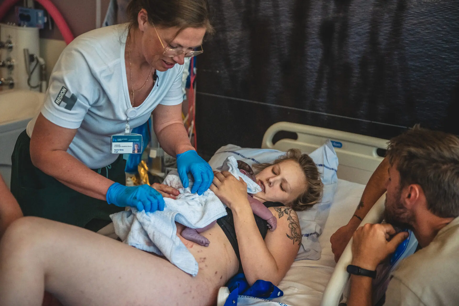 I udgangspunktet er det jordemoderen, der tager imod dit nyfødte barn og lægger barnet op på brystet af dig eller din partner eller anden pårørende.